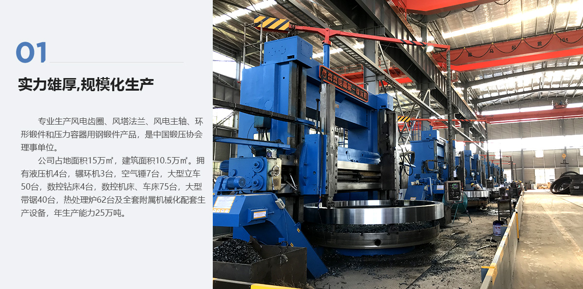 公司占地面積15萬(wàn)㎡,建筑面積10.5萬(wàn)㎡。擁有(800t、2000t、5000t)液壓機(jī)4臺(tái),(2000mm、3500mm、6300mm)輾環(huán)機(jī)3臺(tái),(250-1750kg)空氣錘7臺(tái),(2500-8000mm)大型立車(chē)50臺(tái),(5-8米)數(shù)控鉆床4臺(tái),數(shù)控機(jī)床、車(chē)床75臺(tái),大型帶鋸40臺(tái),熱處理爐62臺(tái)及全套附屬機(jī)械化配套生產(chǎn)設(shè)備,年生產(chǎn)能力25萬(wàn)噸。