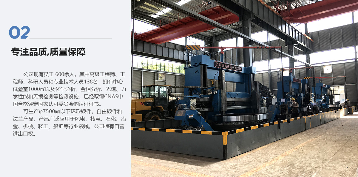 公司現(xiàn)有員工 600余人,其中高級(jí)工程師、工程師、科研人員和專(zhuān)業(yè)技術(shù)人員138名,擁有中心試驗(yàn)室1000㎡以及化學(xué)分析、金相分析、光譜、力學(xué)性能和無(wú)損檢測(cè)等檢測(cè)設(shè)施,已經(jīng)取得CNAS中國(guó)合格評(píng)定國(guó)家認(rèn)可委員會(huì)的認(rèn)證證書(shū)??缮a(chǎn)φ7500㎜以下環(huán)形鍛件,自由鍛件和法蘭產(chǎn)品,產(chǎn)品廣泛應(yīng)用于風(fēng)電、核電、石化、冶金、機(jī)械、輕工、船泊等行業(yè)領(lǐng)域。公司擁有自營(yíng)進(jìn)出口權(quán)。查看詳情 | >
