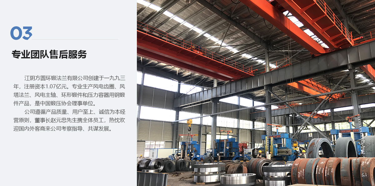 江陰方圓環(huán)鍛法蘭有限公司創(chuàng)建于一九九三年,注冊(cè)資本1.07億元。專(zhuān)業(yè)生產(chǎn)風(fēng)電齒圈、風(fēng)塔法蘭、風(fēng)電主軸、環(huán)形鍛件和壓力容器用鋼鍛件產(chǎn)品,是中國(guó)鍛壓協(xié)會(huì)理事單位。
